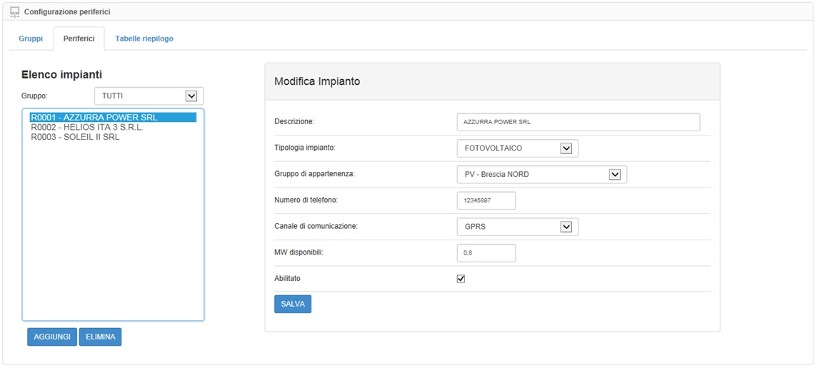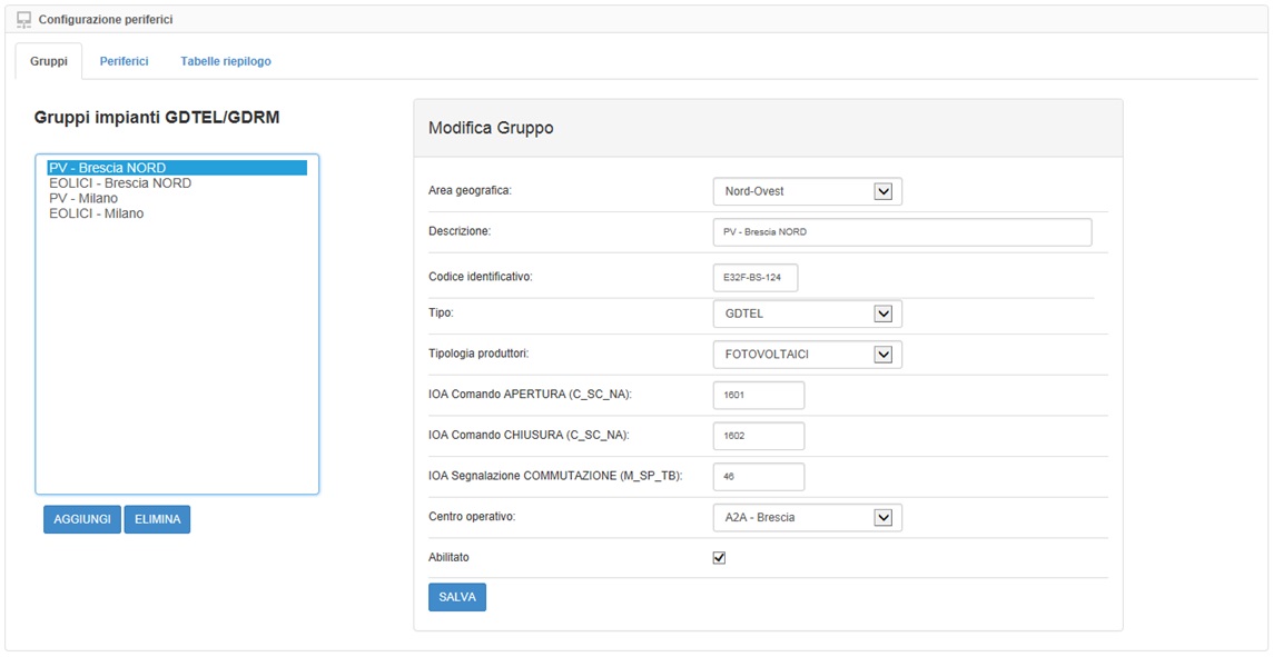Il sistema consente in base alle indicazioni presenti nell’allegato A72, la configurazione di Gruppi e delle Periferiche che appartengono ad ogni gruppo. Ogni Gruppo sarà identificato da una descrizione e da un codice, da una tipologia di impianti che lo comporranno (PV o Eolici) e per consentire la riceziona dei comandi IEC104 dal centro del distributore dovremo inserire i rispettivi IOA che ci serviranno per aprire/chiudere/segnalare l’attuazione.