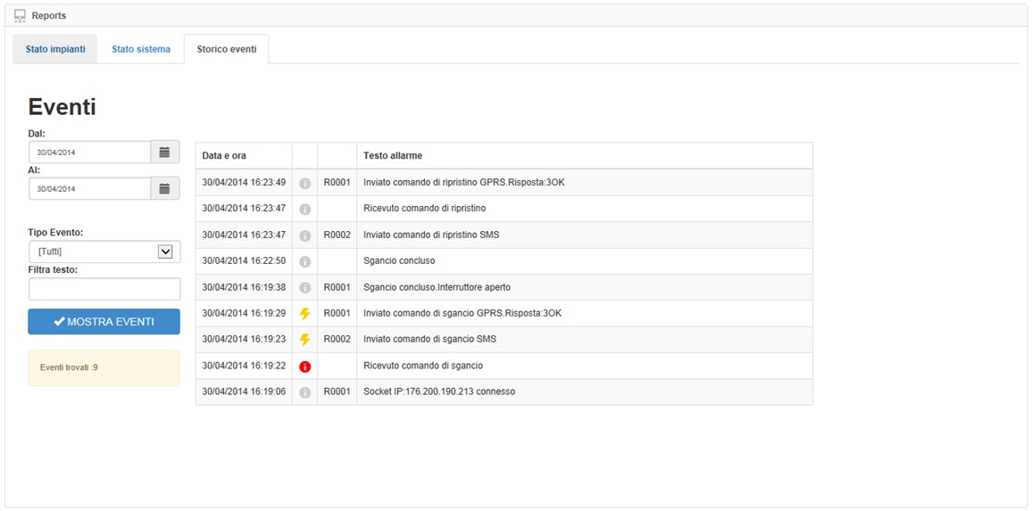 La pagina consente di recuperare gli eventi verificatisi in un determinato periodo temporale, in modo da poter analizzare eventuali anomalie.